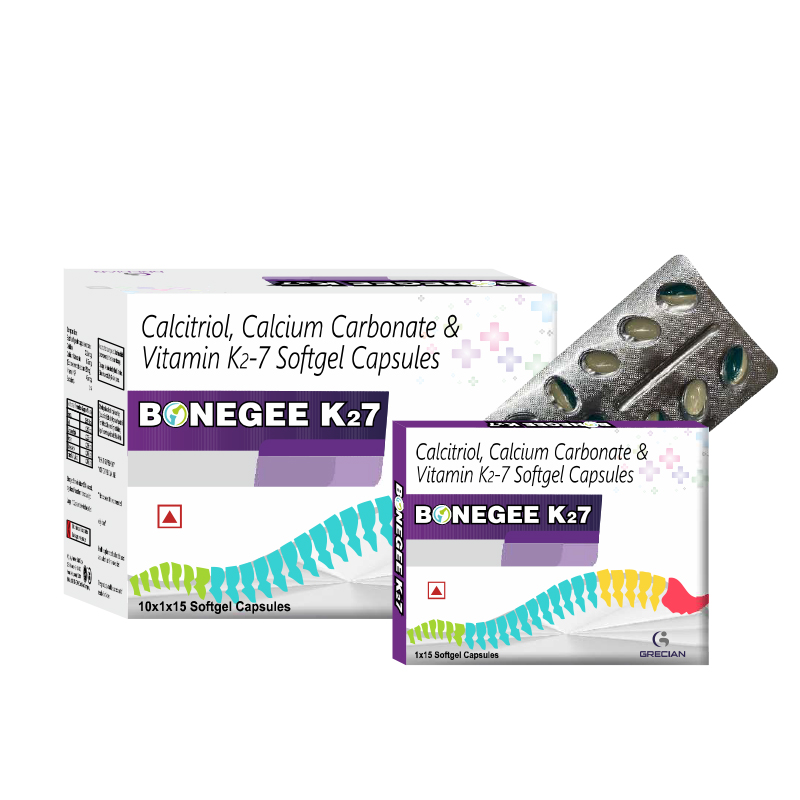 BONEGEE K2-7 is used to treat low blood calcium levels and various associated conditions caused by low calcium levels in the body, such as osteoporosis, osteomalacia, hypoparathyroidism, and tetany. It consists of Calcium (mineral), Calcitriol (Vitamin D3), and Vitamin K2-7.